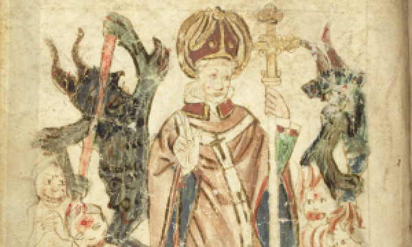 St Patrick standing on a snake in Purgatory: England, 1451 (London, British Library, MS Royal 17 B XLIII, f 132v)